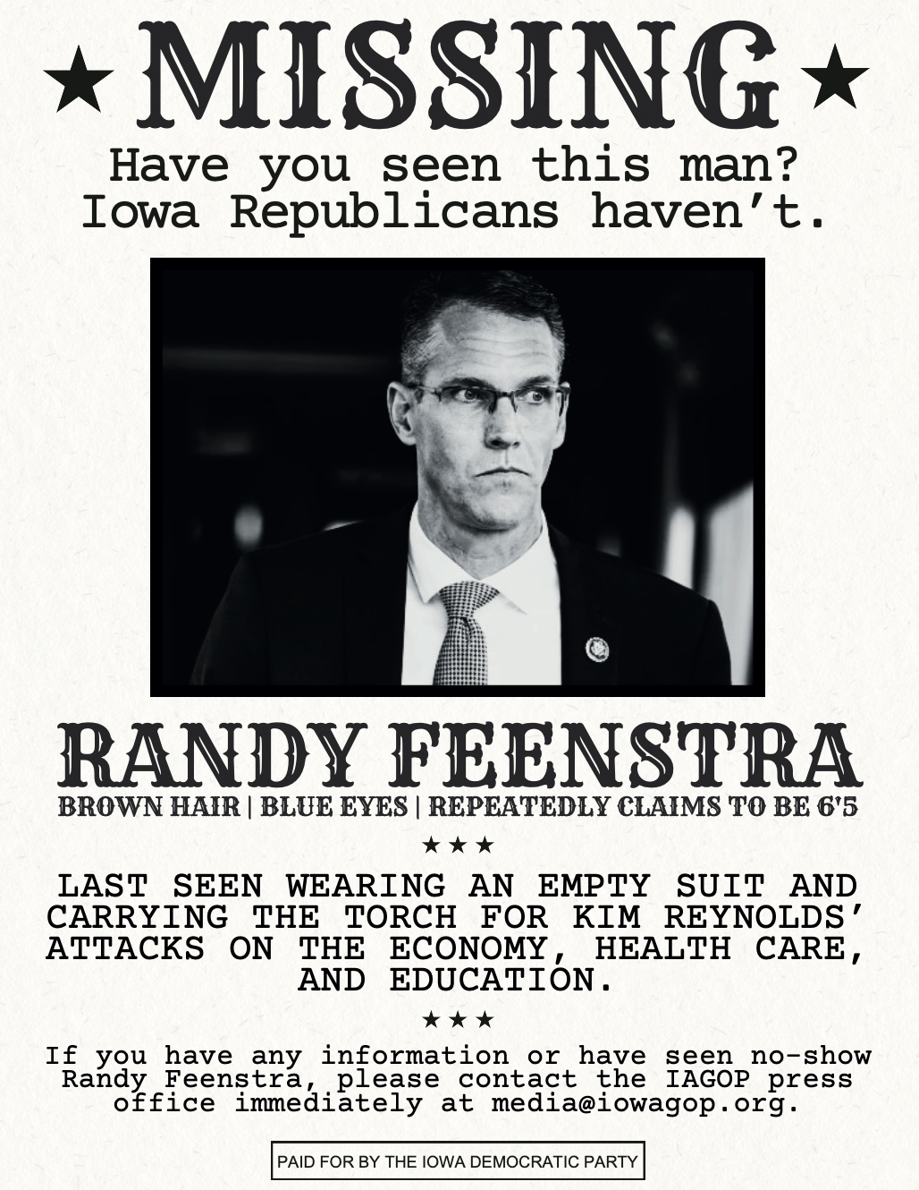 - Mudslinging and finger pointing: Steen, Lahn, Sherman, and Andrews have spent months attacking Feenstra for hiding from the campaign trail and doubting his ability to win. Last week, Steen said the IAGOP will have to “drag [Feenstra] across the finish line” in a general election, adding “I don’t know if that’s possible.” Lahn also flamed Feenstra’s absence with an AI-generated image of the Republican field in his private plane and offered to pick Feenstra up and fly him out to the debate.