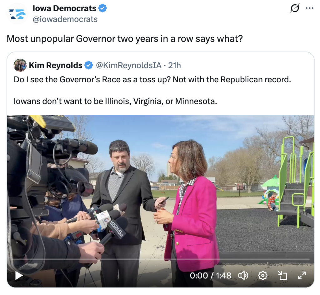 Also this week, Feenstra continued hiding from Iowans and remains the only Republican or Democratic gubernatorial candidate yet to appear on Iowa Press, the must-do public affairs show for any serious candidate in Iowa.